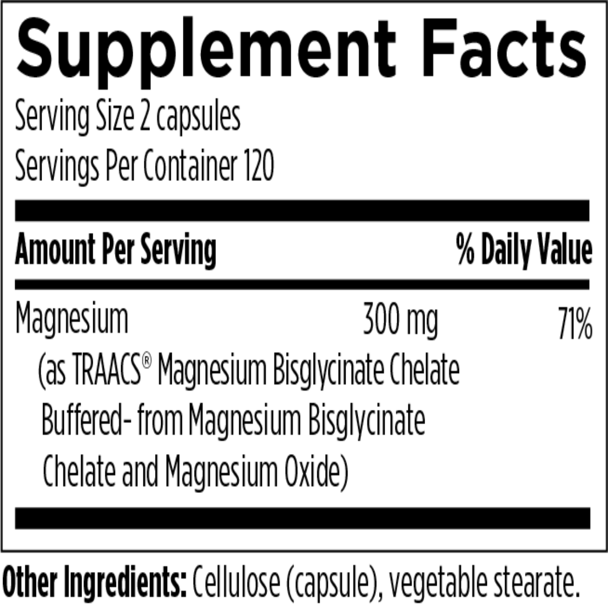 Magnesium Glycinate Complex is one of the best absorbed forms of magnesium. Each capsule provides 150 mg of elemental magnesium. This product should not cause any of the unfavorable gastrointestinal symptoms associated with magnesium supplementation due to the very stable chelate formed between two glycine molecules and each magnesium ion via a patented process.