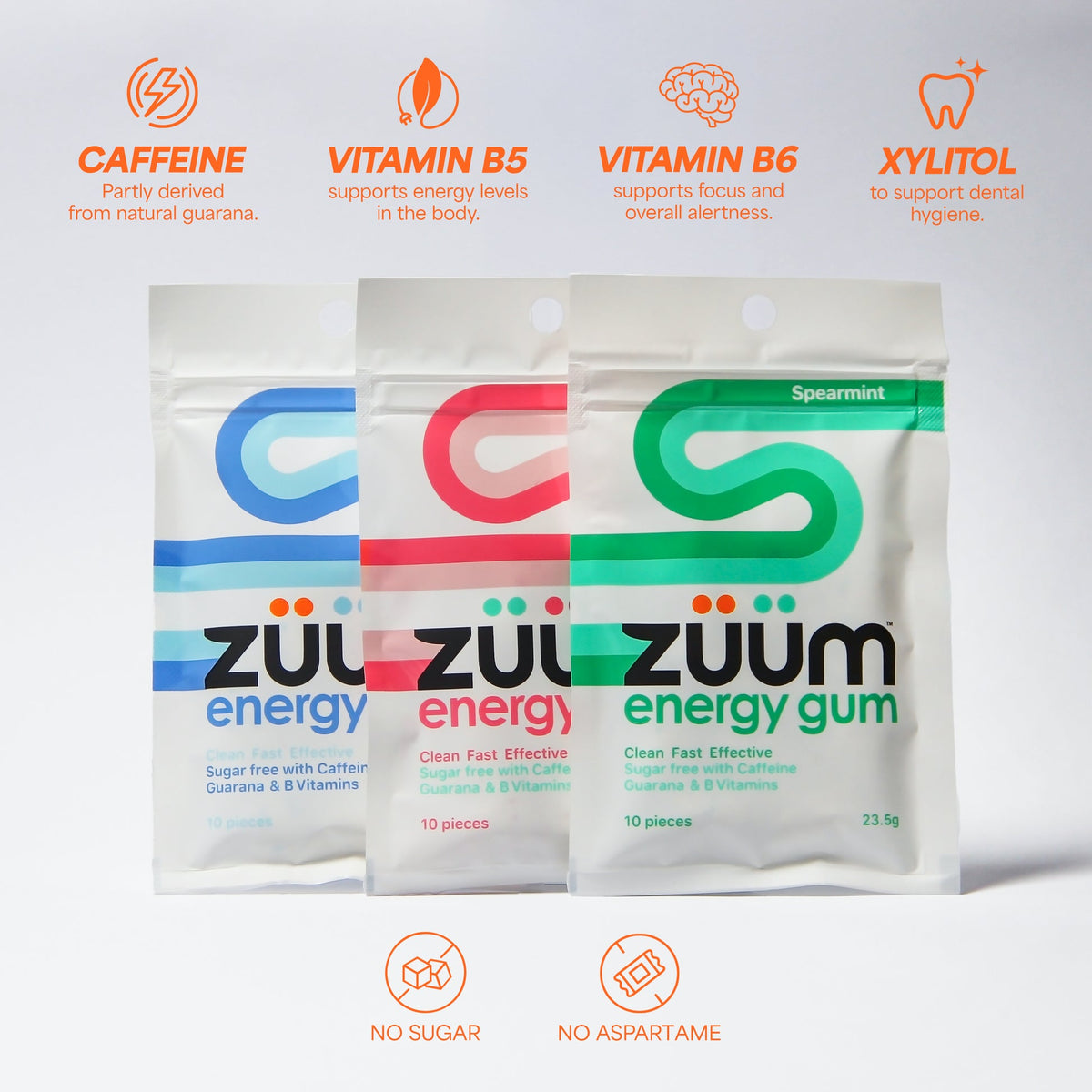 Watermelon is a go-to fruity flavour – think watermelon 5 Gum... but better. The fruity flavour is combined with a touch of spearmint to give Zuum Watermelon the refreshing taste you associate with a crunchy slice of watermelon on a hot Summer’s day. Combined with the natural sweetness of guarana and xylitol, you’ve got a watermelon-flavoured gum with unmatched flavour. The best part? Within 5 minutes of chewing, the active ingredients are fully absorbed into your system, energising you for your day ahead.