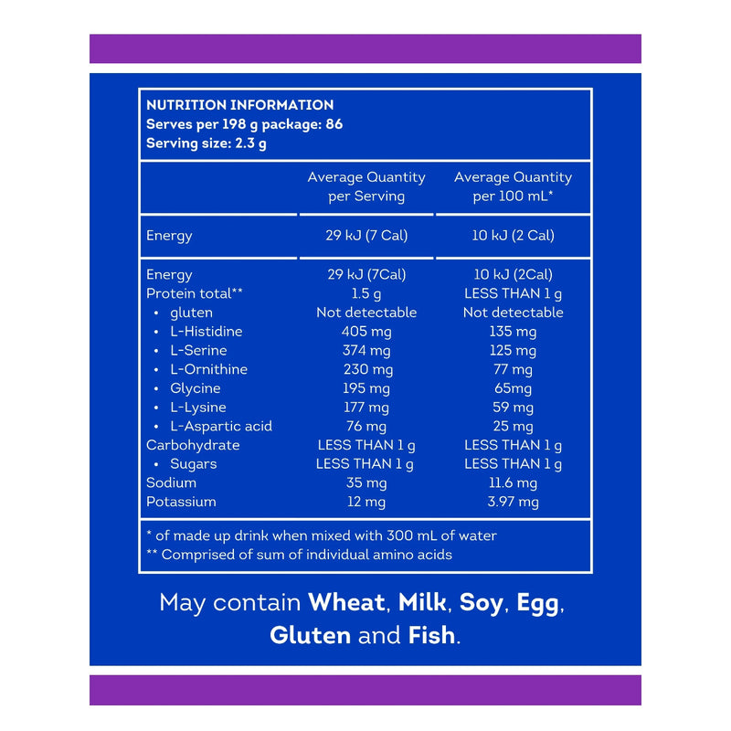 The unique ElectrAAte® formulation is pleasant to drink when mixed with water. Flavour and aroma are typical of unflavoured and unsweetened amino acids in solution (subtle natural lemon flavour with a salty note). Colourless and translucent/cloudy when mixed in water.