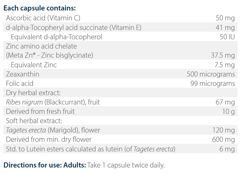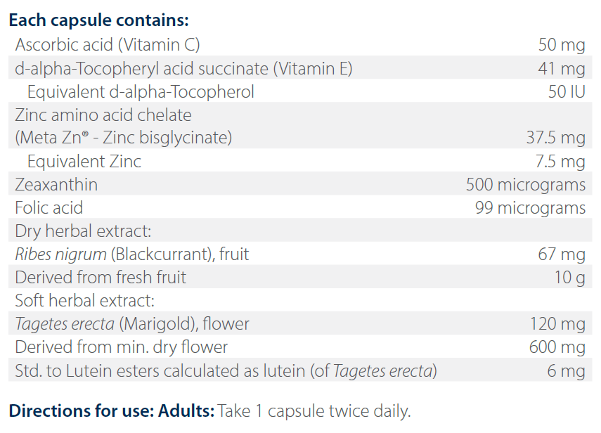 - Contains blackcurrant extract, lutein and zeaxanthin.