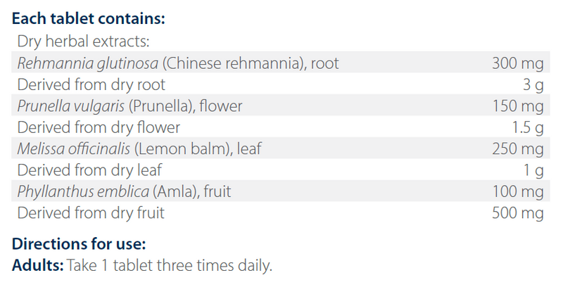 - Calming: Rehmannia glutinosa is traditionally used in Chinese medicine as a yin tonic to improve symptoms of heart fire including insomnia and irritability. In animal studies, Rehmannia glutinosa has reversed morphological changes to the pituitary and adrenal cortex by antagonising the suppressive effect of glucocorticoids on the hypothalamus-pituitary-adrenal axis. The carminative and sedative actions of Melissa officinalis assist those with nervousness and sleeping problems. The possible anxiolytic activity of lemon balm results from an elevation of GABA levels that occurs due to inhibition of GABA-transaminase.