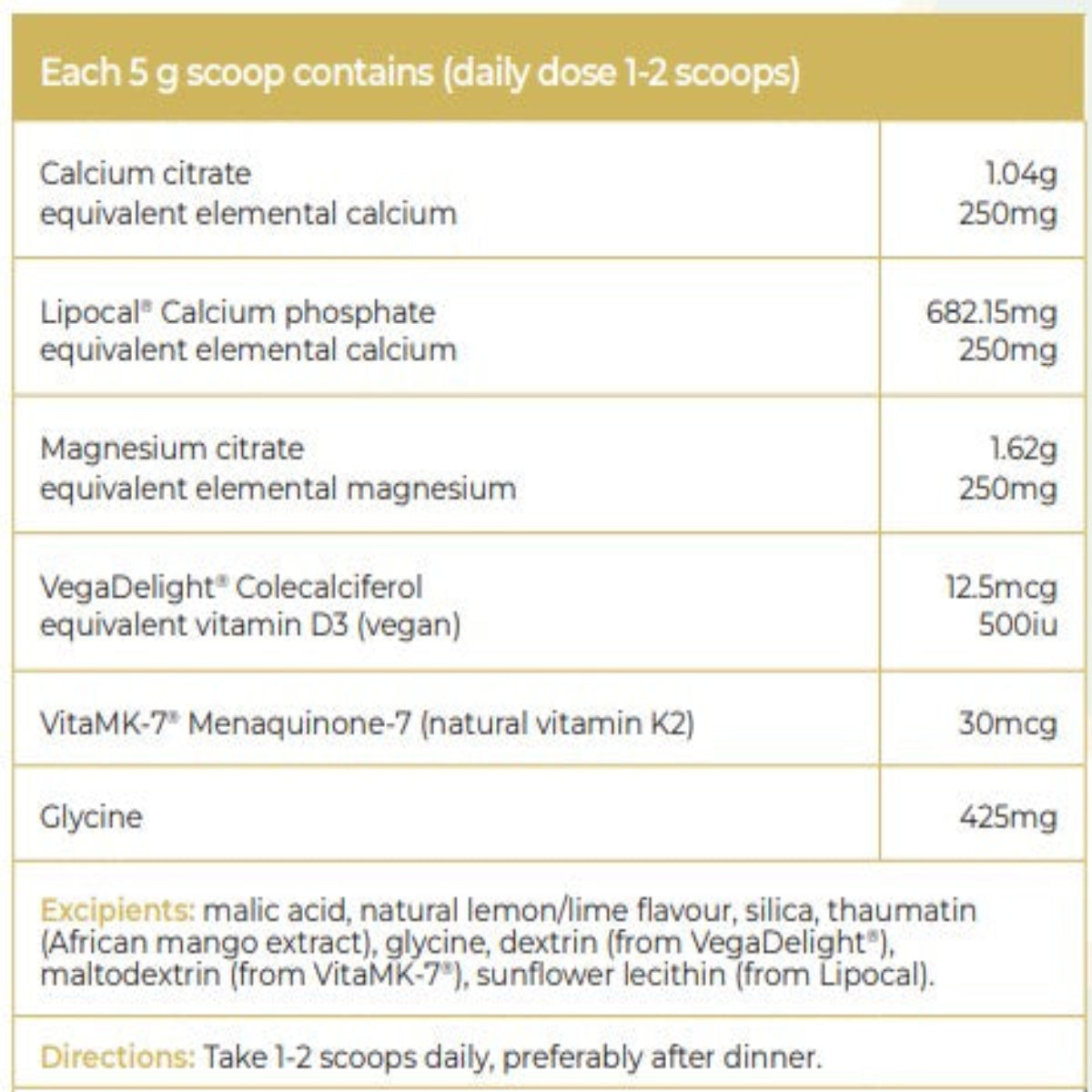 A high quality, high potency calcium and magnesium powder with co-factor vitamins K2 and D3, suitable for vegans. An ultra low excipient formula, free from allergens.