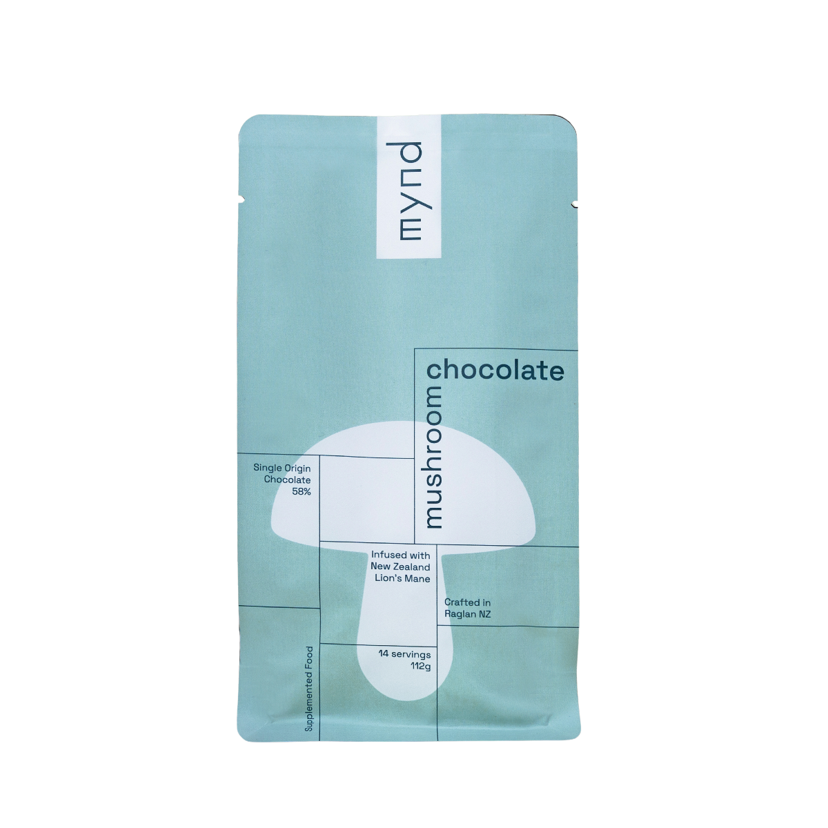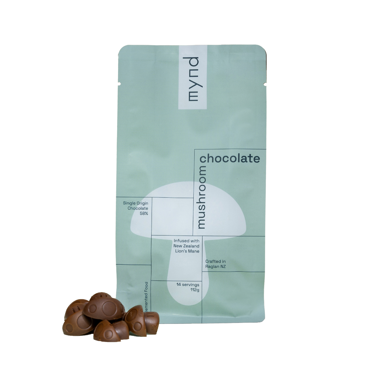 Each bag contains 28 individual mushroom-shaped chocolates. Every two chocolates deliver one full serving (1g) of New Zealand Lion’s Mane.